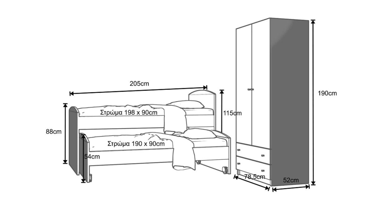 Η διάσταση του στρώματος που επιδέχεται η κουκέτα είναι 90*190.
